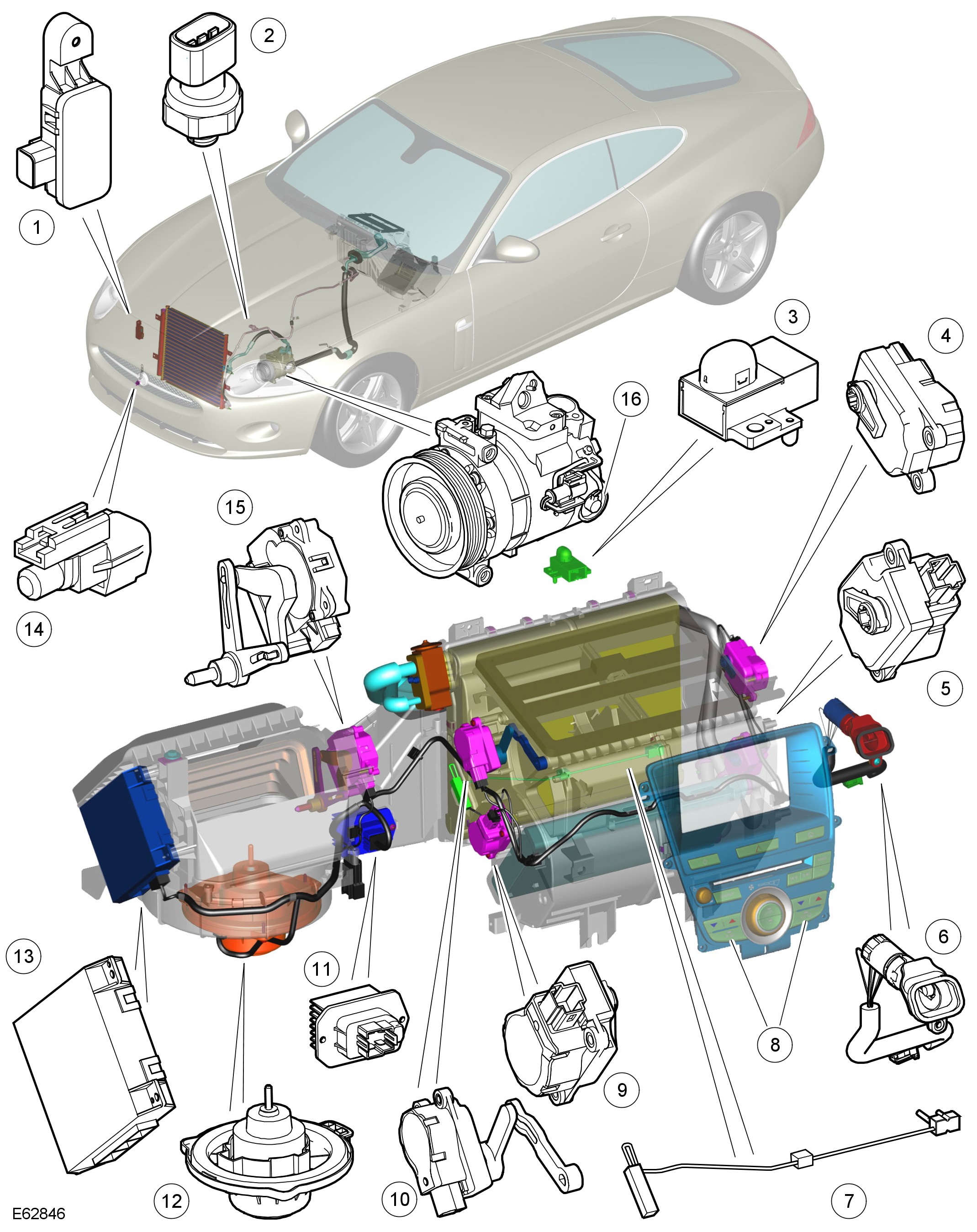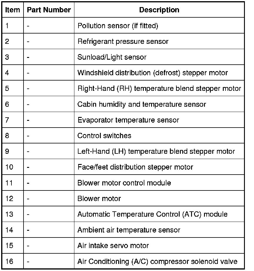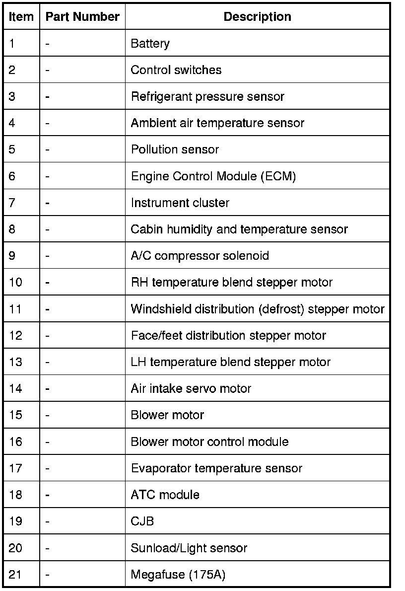 Operation of the blower motor is controlled by the ATC (automatic temperature control) module. The ATC (automatic temperature control) module monitors a feedback voltage from the blower motor control module. In response to the feedback voltage, the ATC (automatic temperature control) module provides a drive signal back to the blower motor control module which is used to regulate the voltage flow across the blower motor and hence regulate blower speed. The blower motor is provided with a battery voltage feed from the blower motor relay, which is located within the auxiliary junction box.
