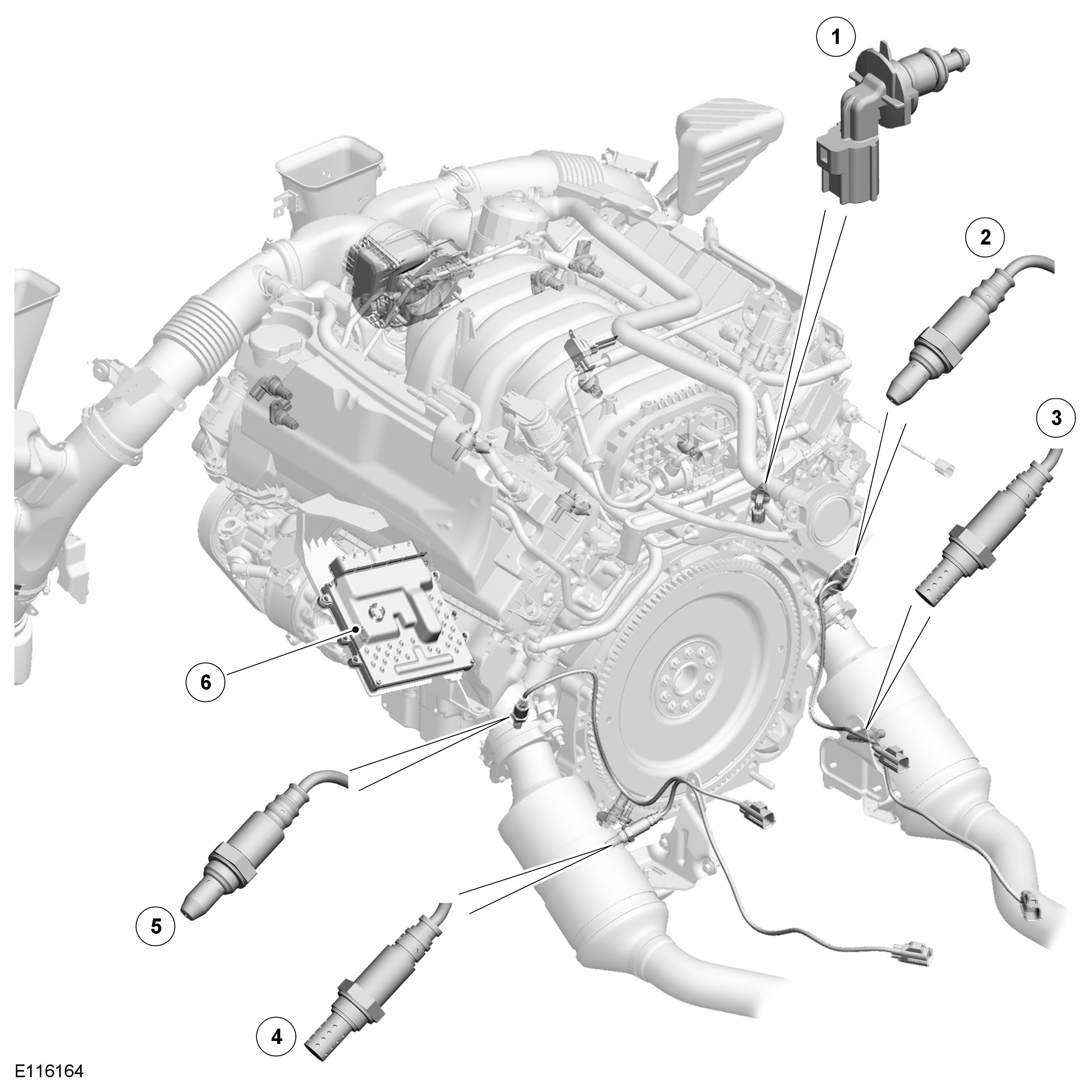 An upstream heated oxygen sensor is installed in the outlet of each exhaust manifold, which enables independent control of the fuel:air mixture for each cylinder bank. A downstream heated oxygen sensor is installed in each catalytic converter, which enables the performance of the catalytic converters to be monitored.