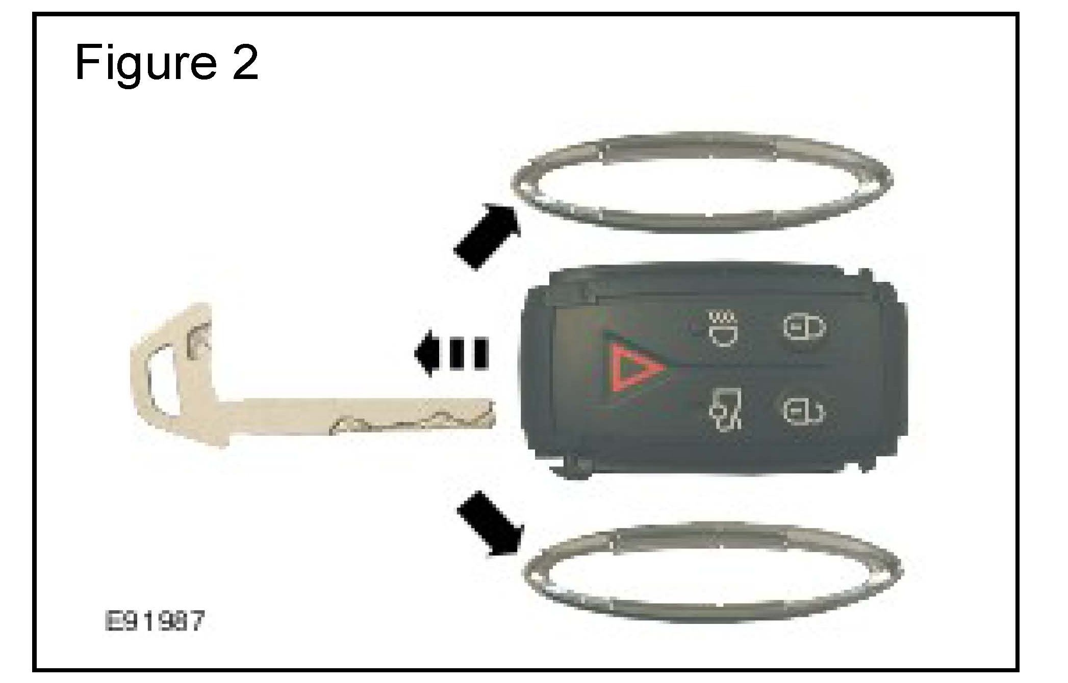 The green printed circuit board, battery or the battery contacts (arrowed in E91988) may NOT be touched during the work procedure. Oil or contamination on either can affect the key fob performance.