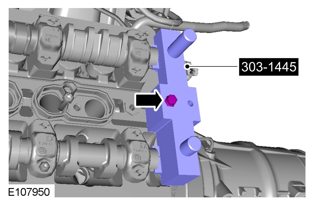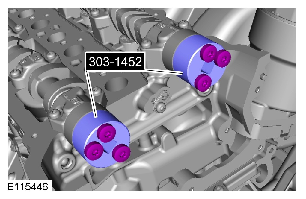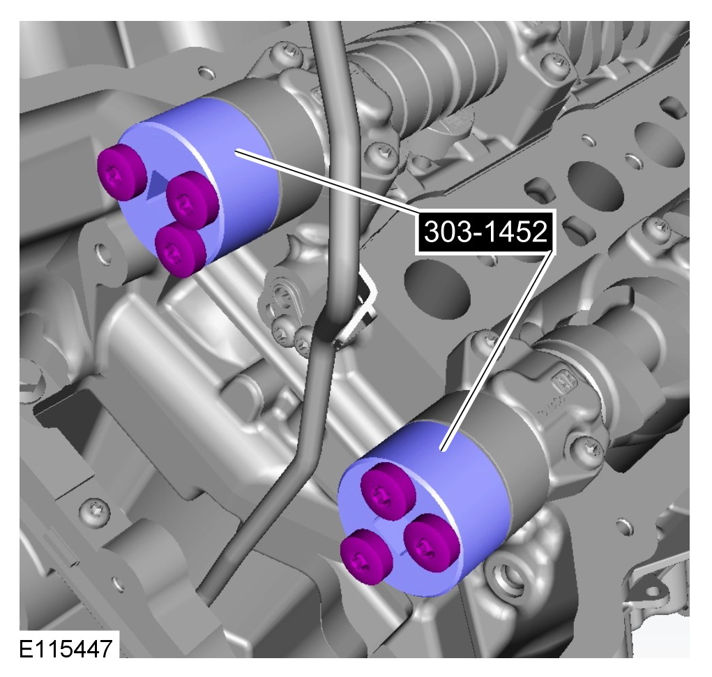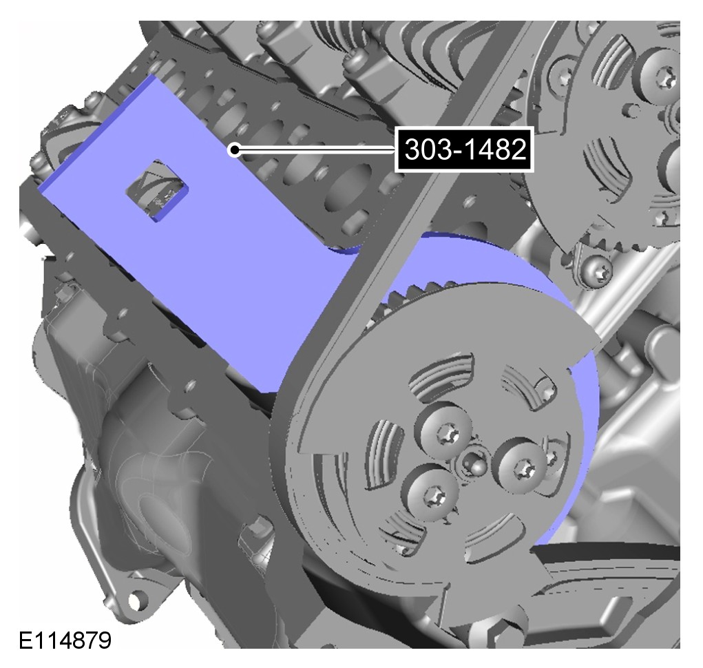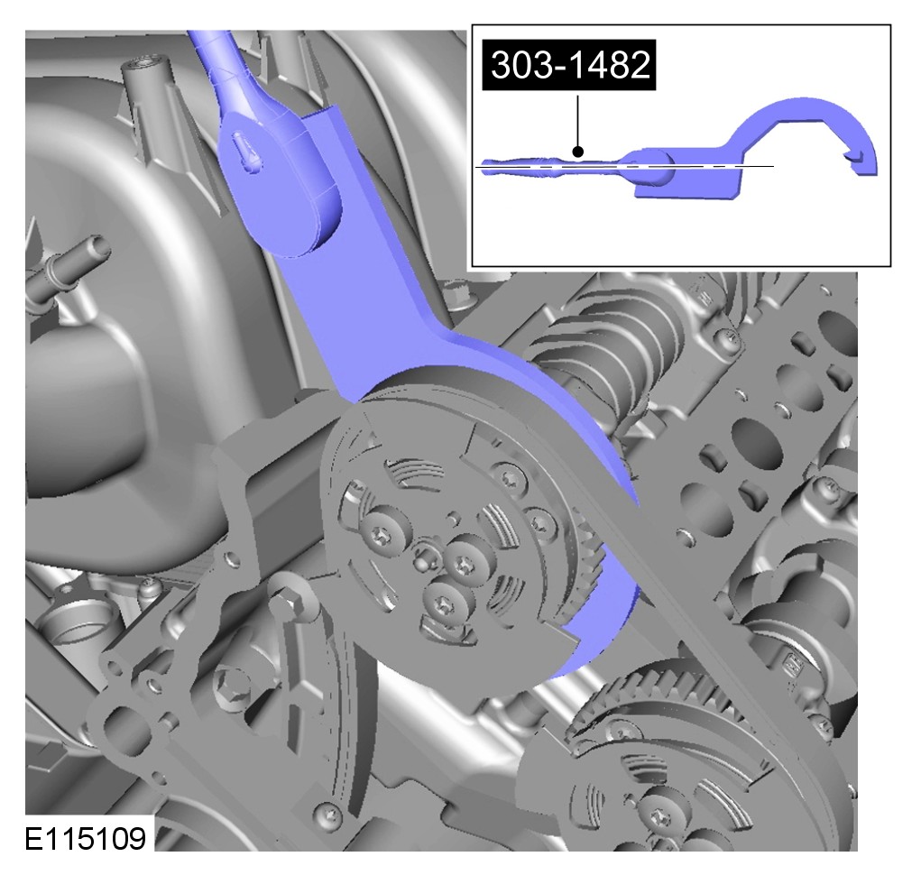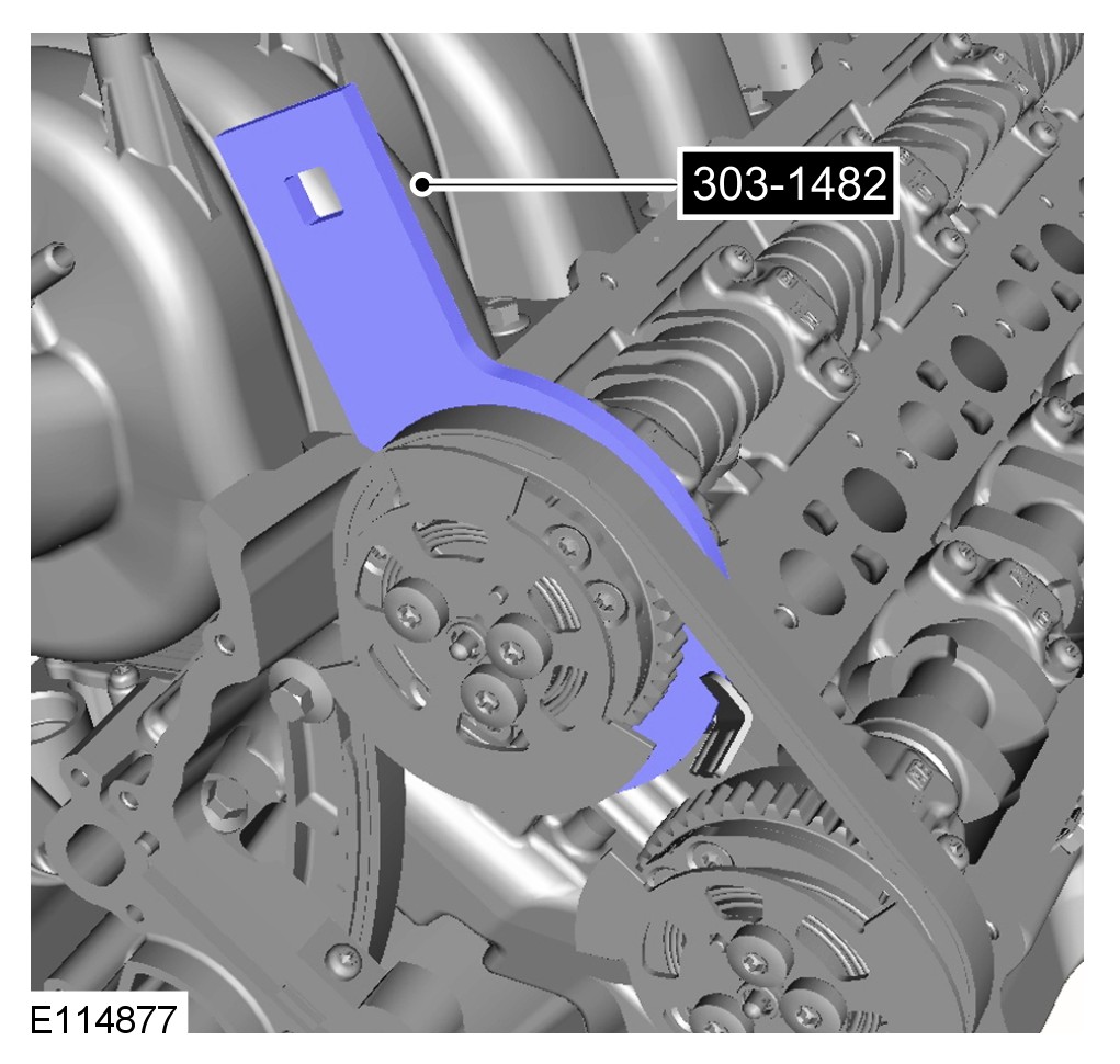 CAUTION: When tightening the special tool to the camshafts make sure that the camshafts are rocked using the special tool 303-1482 until there is no more movement.