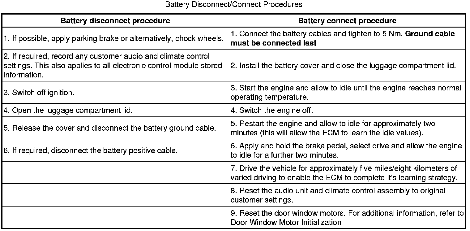 Following reconnecting of the battery, the engine should be allowed to idle as the stored idle and drive values contained within the engine control module (ECM) will have been lost. This may cause driveability concern if the following procedure is not carried out.