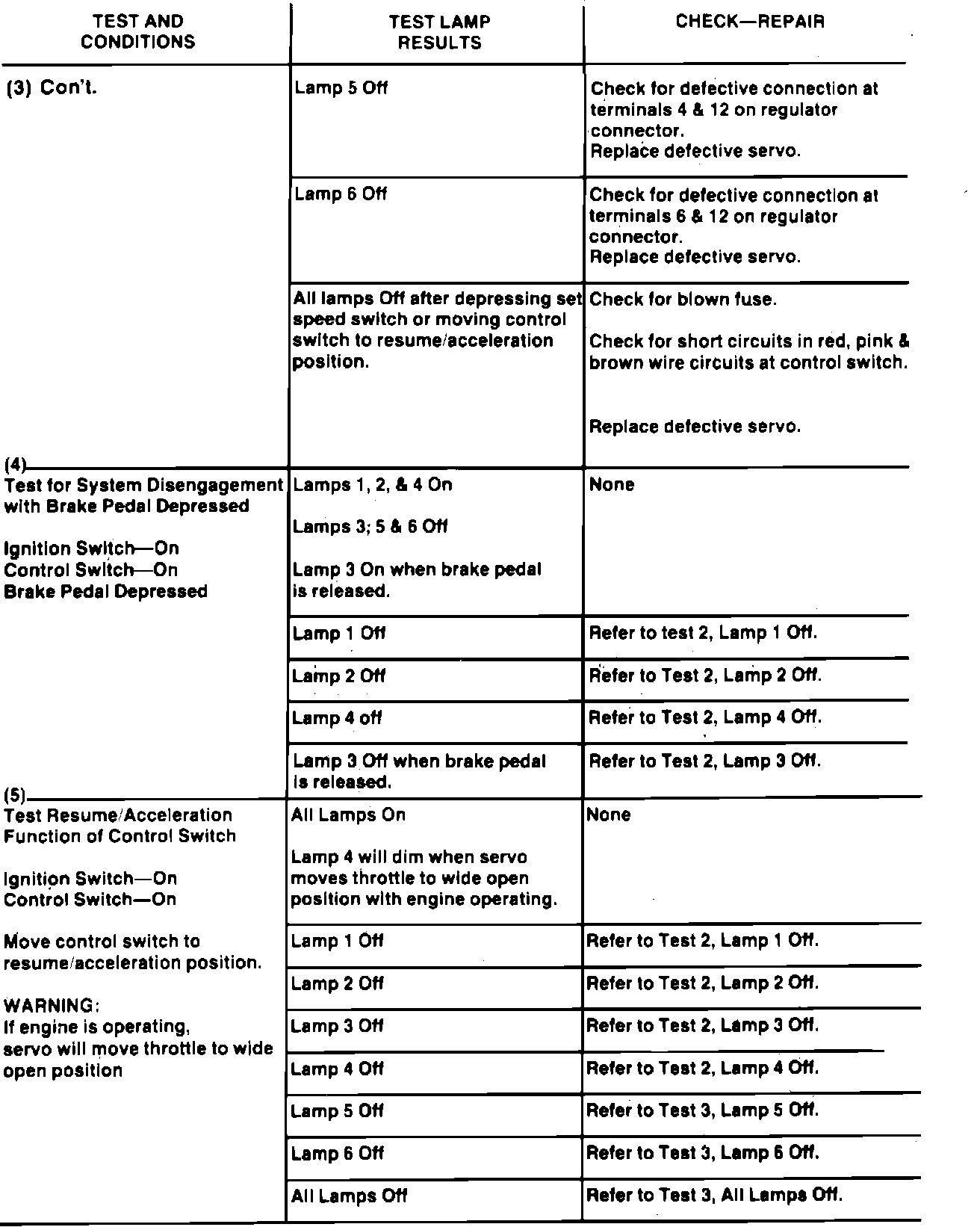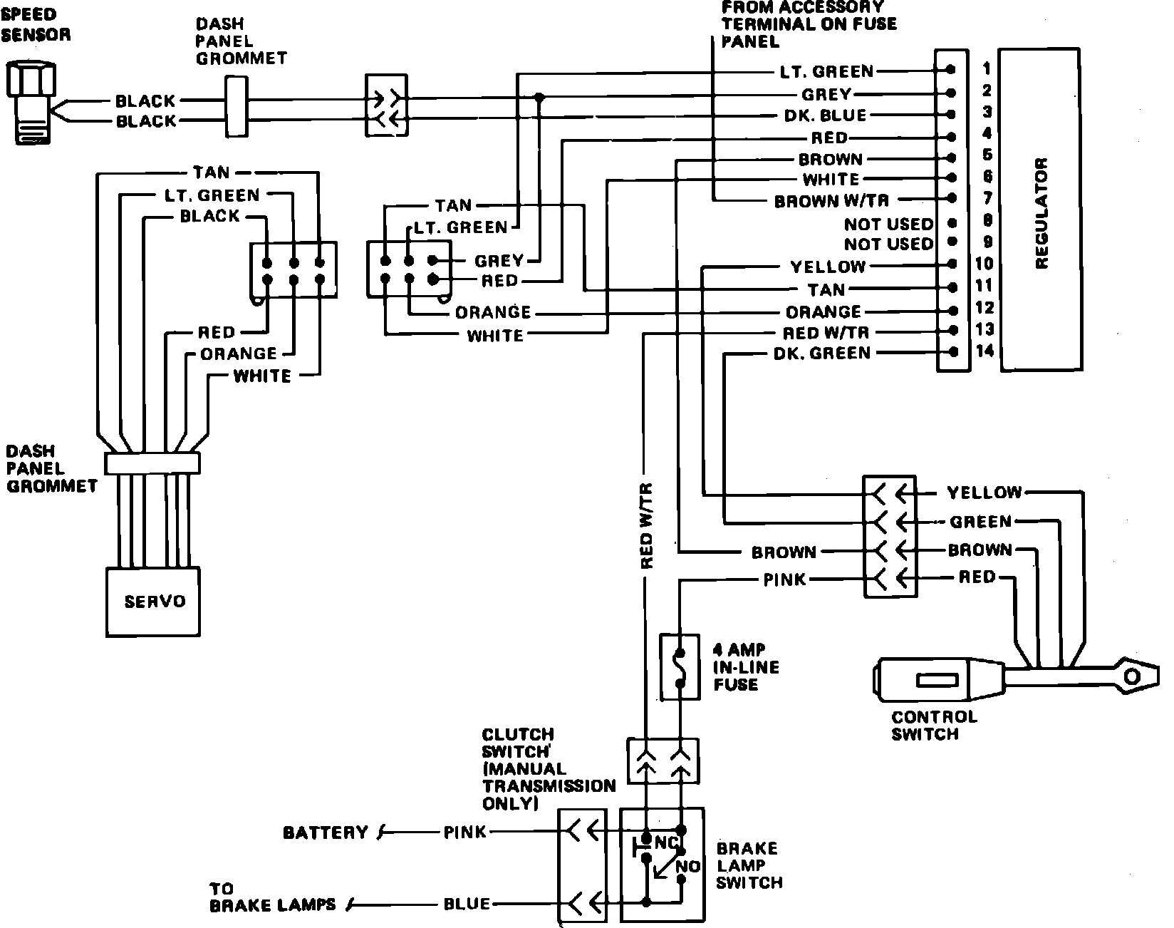 Whenever a Cruise Command malfunction occurs, first ensure that the wiring harness is properly connected to the regulator. A poor connection can cause a complete or intermittent system malfunction, resulting in a non-testable flaw, or a misdiagnosed regulator malfunction. Refer to figure above for wiring diagrams and troubleshooting procedures.