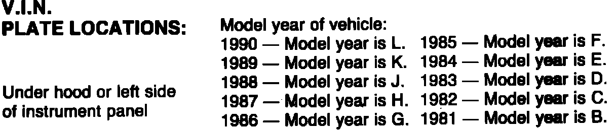 1 MODEL YEAR IDENTIFICATION: When shown as part of the Vehicle Identification Number (V.I.N.), the year is indicated by the last digit of the model year or as a code letter.