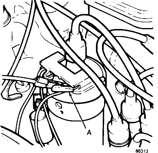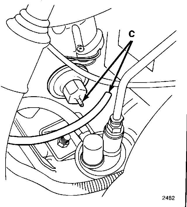 5. Disconnect and plug the distributor vacuum advance hose (C).
