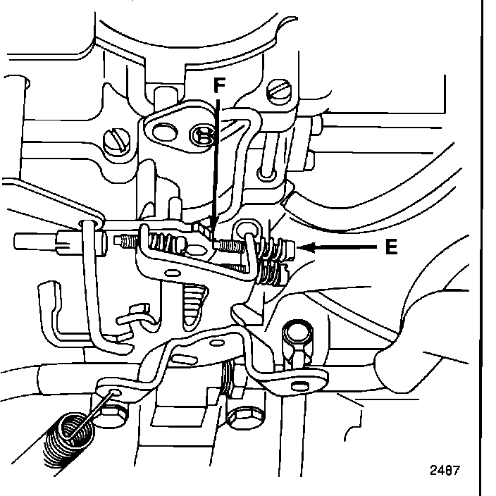 4. Position the fast idle speed adjustment screw (E) in contact with and against the shoulder of the second step (F) of the fast idle cam.