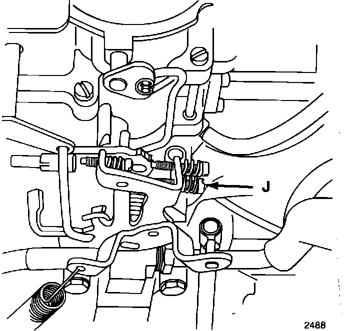 6. Adjust the carburetor curb (slow) idle speed adjustment screw (J) to obtain the specified curb (slow) idle speed rpm. Refer to the Vehicle Emission Control Information label.