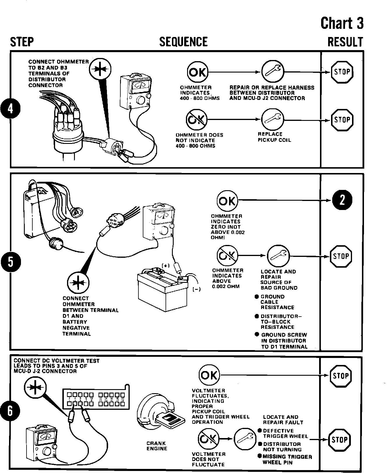 The Sensor Check and Control Unit Check diagnostic procedure, on pages 42 and 43 of Supplement No. 1 to the 1982 AMC Technical Service Manual, are incorrect. Steps 2, 4 and 6 of this procedure have been revised to show the correct ohmmeter and voltmeter test probe test points required with the engine compartment wire harness connectors used in 1983 models.