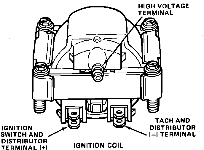 3. Connect ohmmeter set at high resistance scale between coil negative and high voltage terminals. Ohmmeter should indicate less than infinite resistance, if not replace coil.
