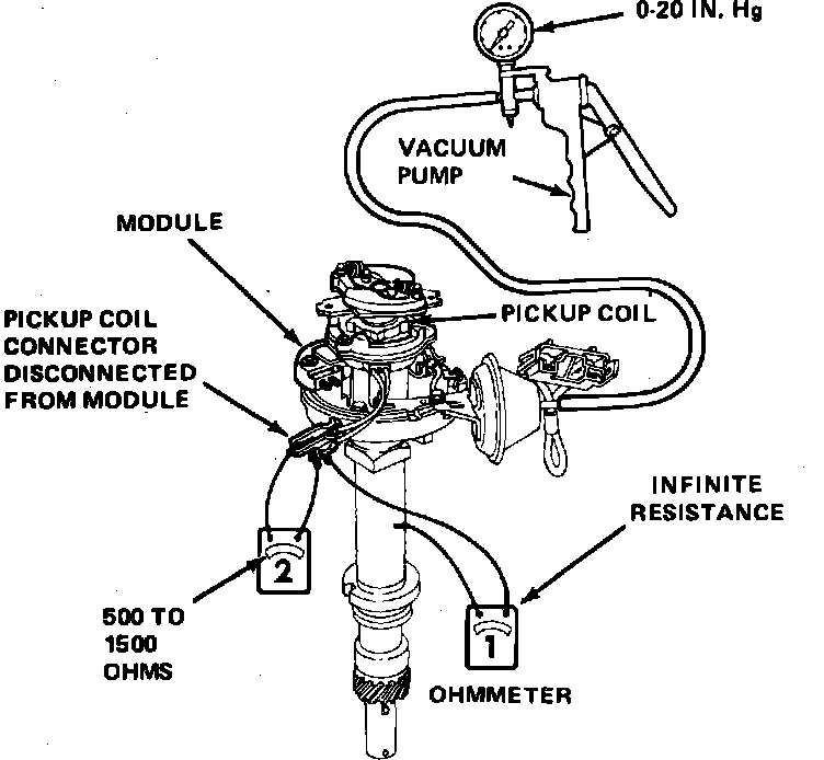 5. Connect ohmmeter between both pickup coil connector terminals. While flexing pickup coil wire, operate vacuum pump and note ohmmeter reading. Ohmmeter should indicate 500 to 1500 ohms at all times, if not replace pickup coil.