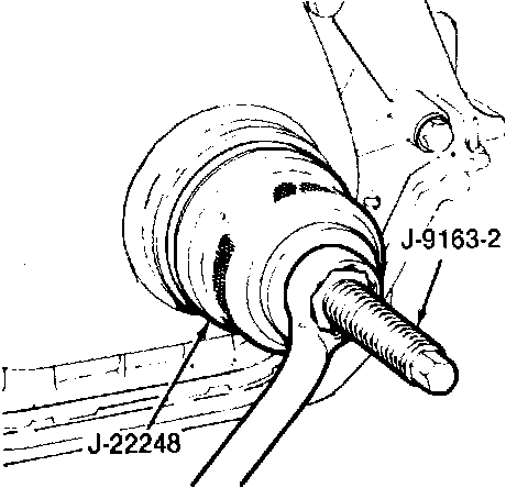 16. Position alignment tool and seal over crankshaft snout, then insert installation tool J-9163-2 or equivalent into alignment tool as shown, Fig. 13. Tighten nut on installation tool until alignment tool contacts timing cover. Remove tool.