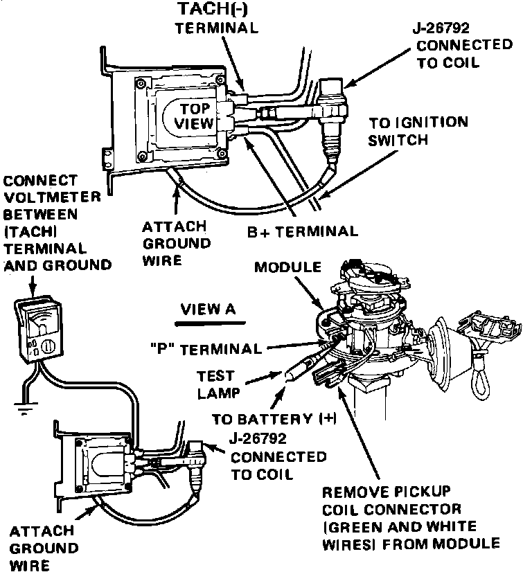 7. Using tool No. J-26792, check for spark at coil output terminal as test lamp is remove from module P terminal, Fig. 3 (view B).