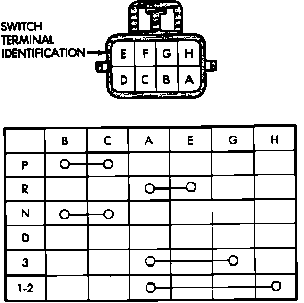 Test switch continuity with an ohmmeter. Disconnect the switch and check continuity at the connector terminal positions and in the gear ranges indicated below. Switch continuity should be as follows: