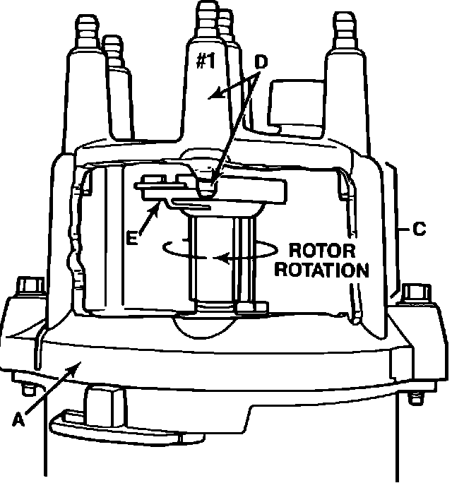3. Remove the distributor cap (A) and cut a "window" (C) into the side of the distributor cap at the #1 spark plug wire post (D). The "window" should be large enough to allow easy visual inspection of the position of the distributor rotor (E) at the #1 spark plug wire post. Reinstall the distributor cap. Figure 1