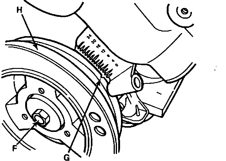 4. Install a wrench or socket onto the vibration damper retaining bolt (F). Rotate the engine in a clockwise direction until the #1 cylinder is at top dead center. Align the timing mark (G) on the vibration damper (H) with the "0" degree mark on the front cover timing scale. The tip of the distributor rotor should be near the #1 spark plug wire post. Figure 2