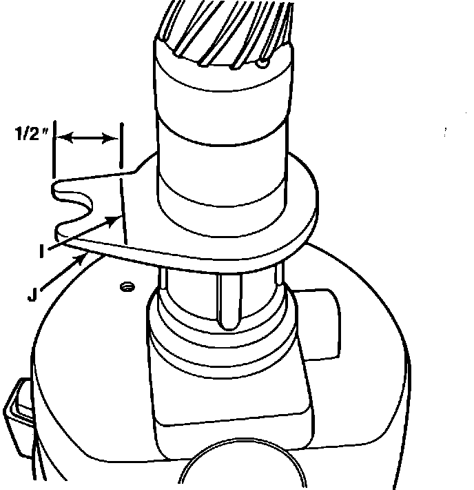 6. Place the distributor housing upside down in a soft jaw vise. Scribe a line (I) 1/2 inch from the end of the distributor locating tab (J). Cut the distributor locating tab at the scribed line with a saw.