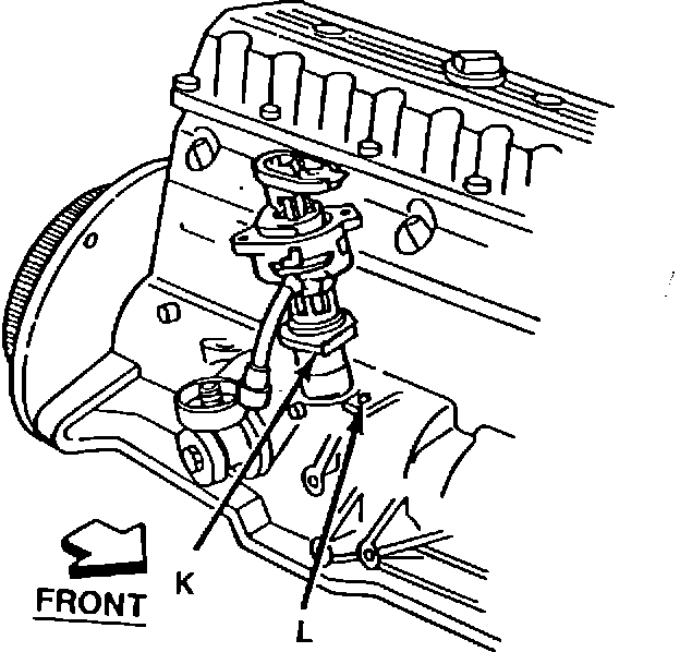 9. Visually align the modified locating tab area (K) of the distributor housing with the holddown clamp bolt hole (L). Figure 5