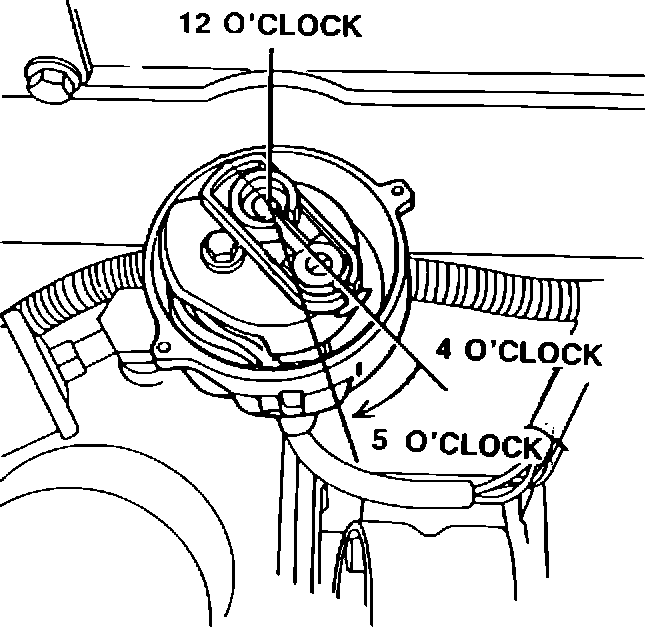 11. Lower the distributor into the engine block until it seats. The rotor should now be very close to the 5 o'clock position. Figure 6