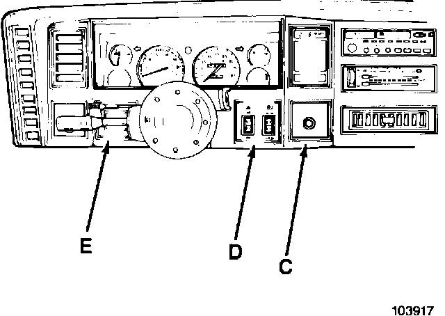 9. Remove the screws attaching the cigarette lighter (C) and the switch housings (D) and (E) to the instrument panel (Fig. 3). Then move the housings aside for working clearance.