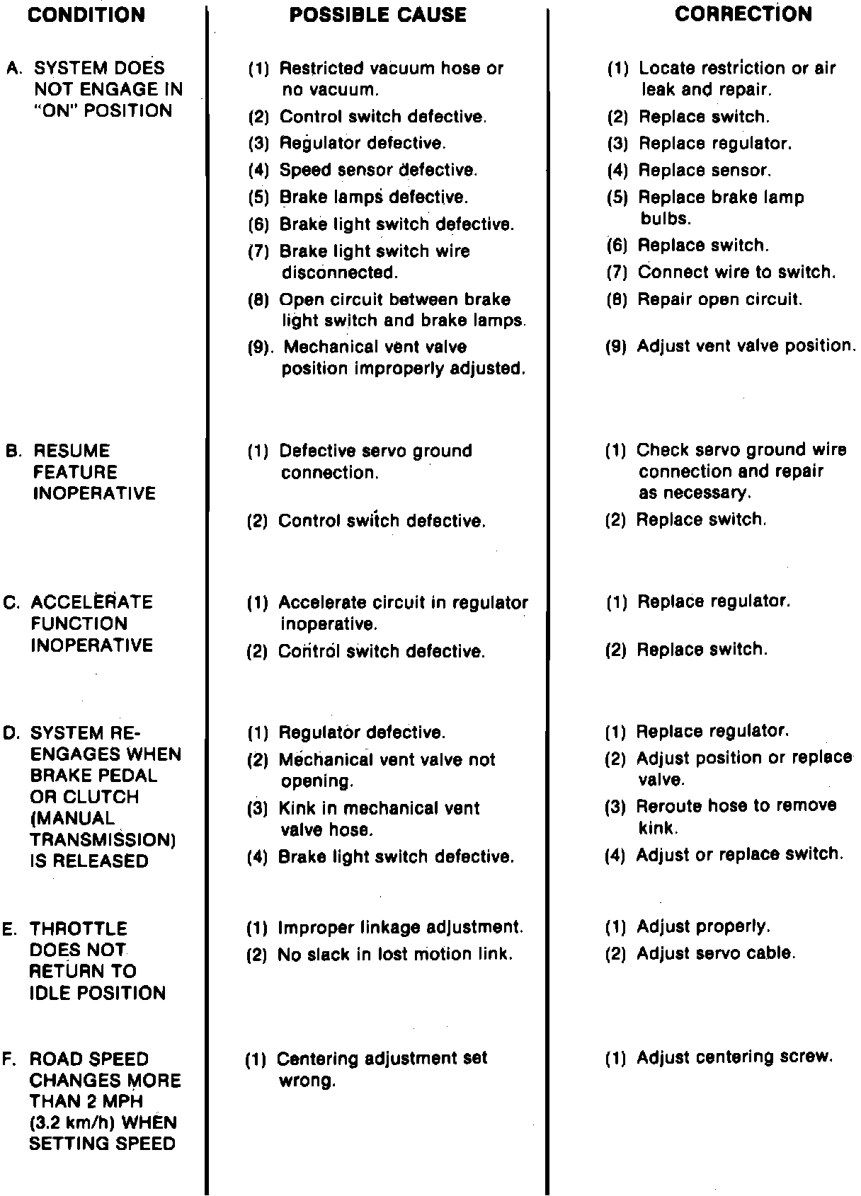 Whenever a Cruise Command malfunction occurs, first ensure that the wiring harness is properly connected to the regulator. A poor connection can cause a complete or intermittent system malfunction, resulting in a non-testable flaw, or a misdiagnosed regulator malfunction.