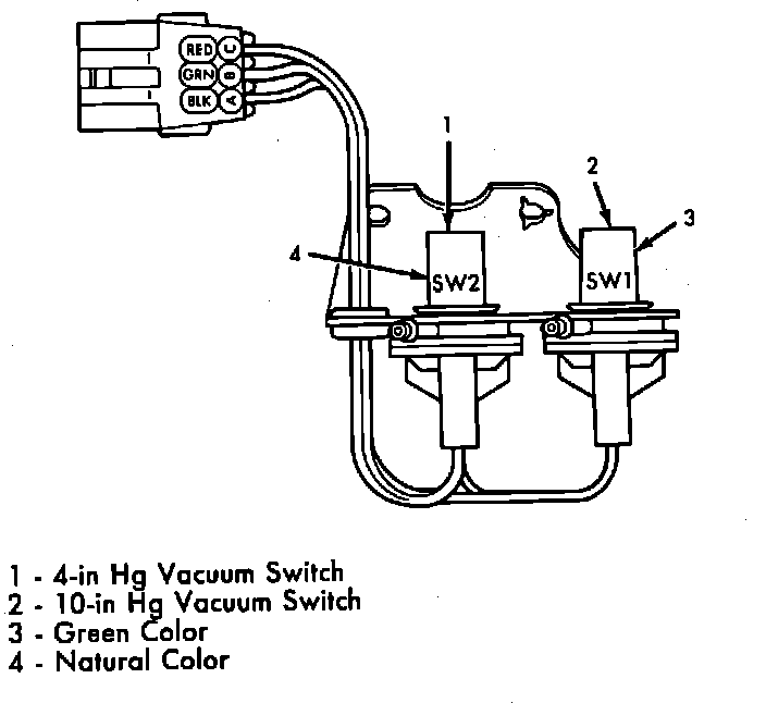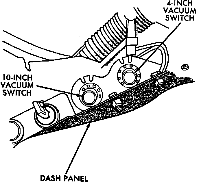 These two vacuum switches are located on the firewall in the engine compartment just behind the engine. The Four-inch switch is controlled by ported vacuum and is a natural color. The Ten-inch switch is controlled by manifold vacuum and is green in color.