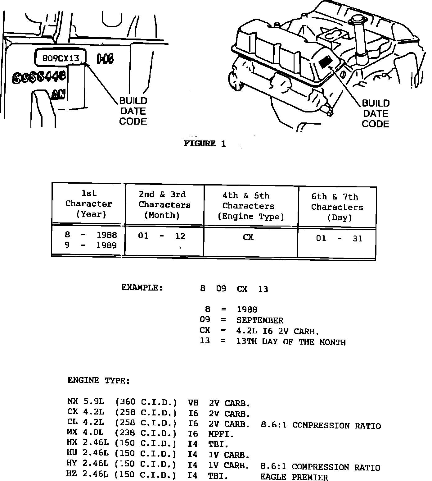 An additional character has been added to the Engine Build Date Code for 1988 Jeep 5.9L, 4.2L, 4.0L and 2.46L engines and the Eagle Premier 2.46L engine.