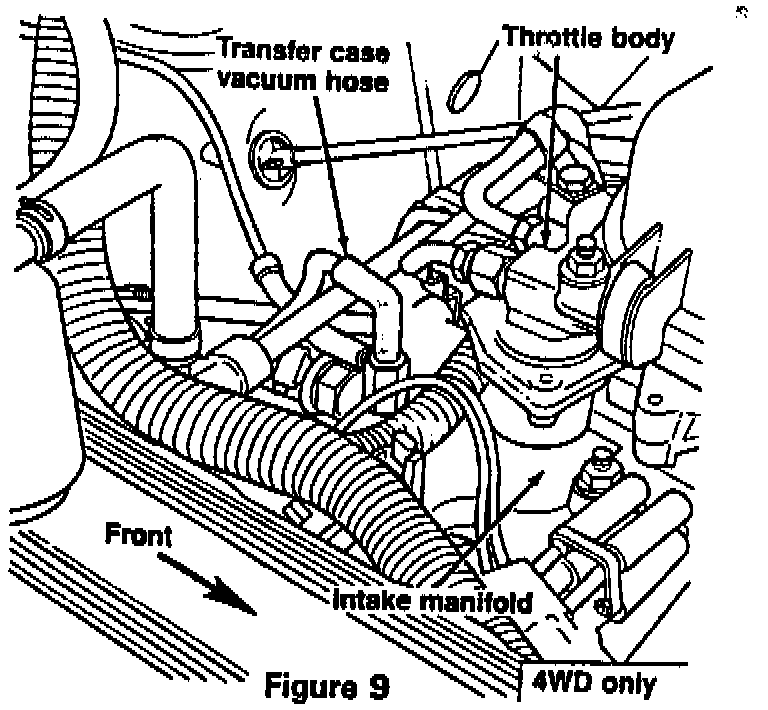 1. Locate and remove rubber vacuum hose near rear of intake manifold, which connects the metal transfer case vacuum tube to the vacuum port on the intake manifold (Figure 9).