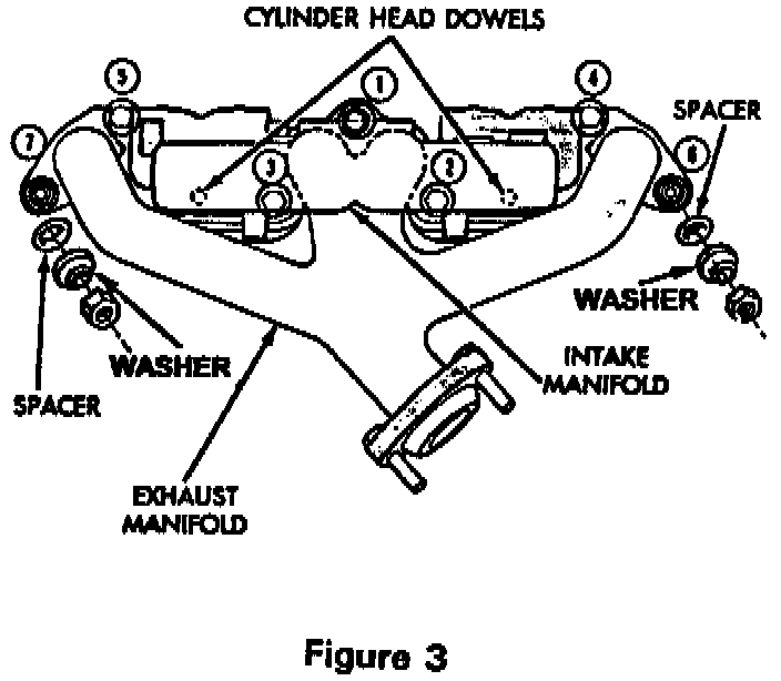 5. Install the exhaust manifold on the studs. The exhaust manifold must be centrally located over the studs and spacers. Loosely install the provided bolt # 1 and nuts with washers for studs # 6 and # 7 (Figure 3).