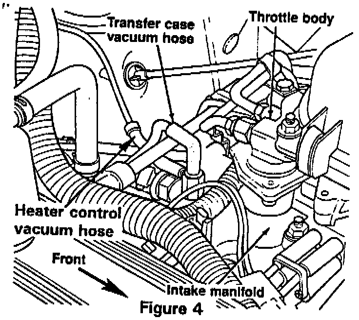 16. Replace the transfer case vacuum hose (if equipped) with the hose provided in the emission service package. Attach the hose to the metal transfer case vacuum tube and the vacuum port on the intake manifold (Figure 4).