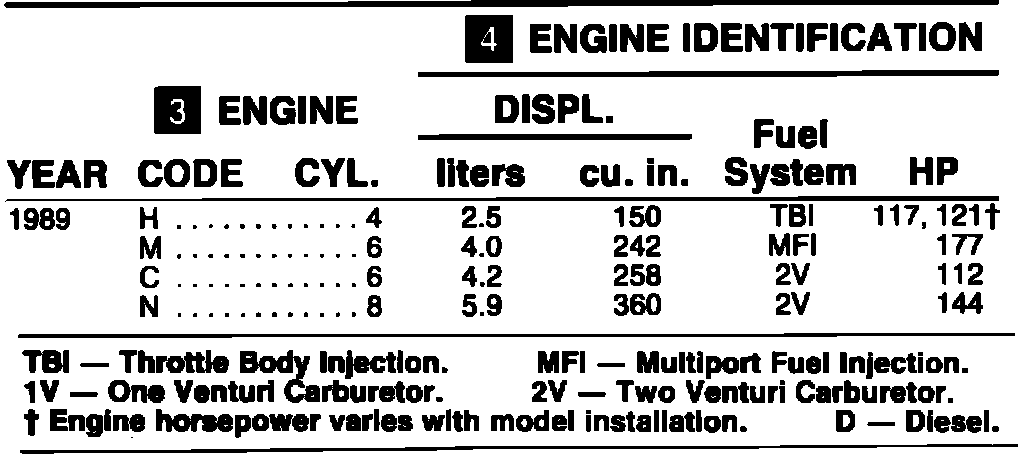 4 ENGINE IDENTIFICATION: On the line where the engine code appears, read to the right to identify the engine.