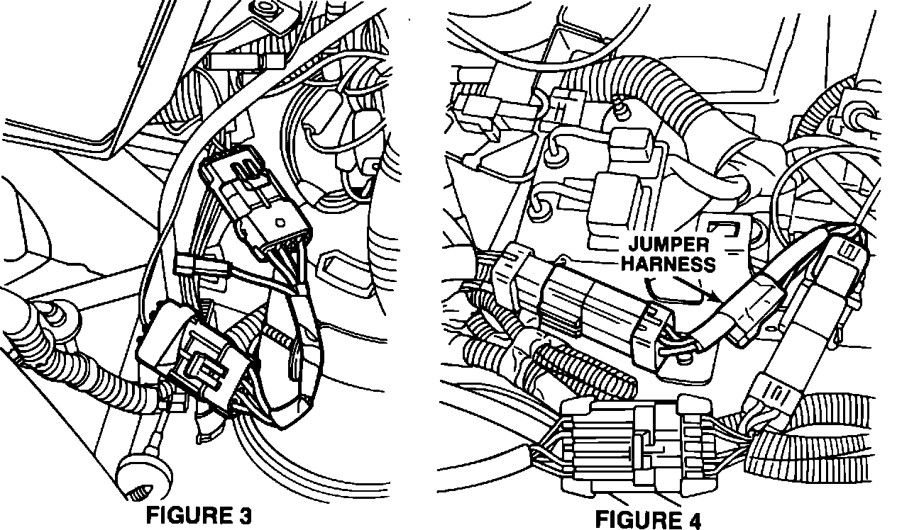 2. Disconnect the EEC connector and install the idle speed jumper harness (B) between the EEC harness connector. Figure 3 shows the Wrangler with idle jumper harness installed. Figure 4 shows the Cherokee, Wagoneer, and Comanche with idle jumper harness installed.