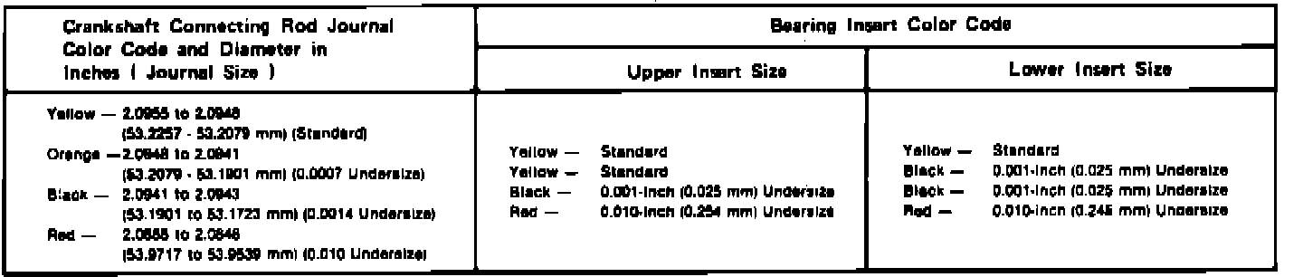 The connecting rod journal is identified by a color coded paint mark on the adjacent cheek or counterweight near the rear of the crankshaft. Color codes used to indicate journal sizes and corresponding bearing sizes are listed in Fig. 24.