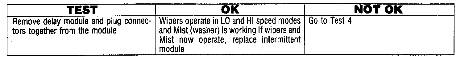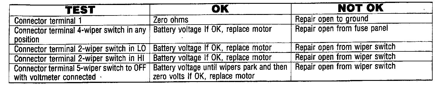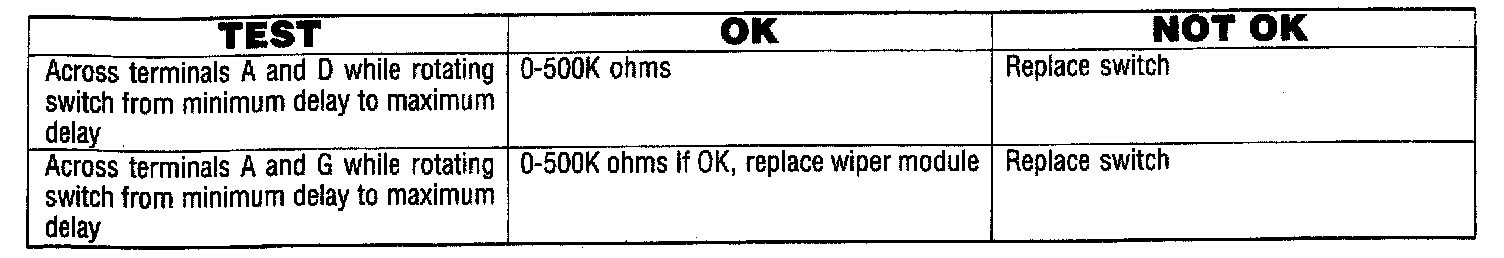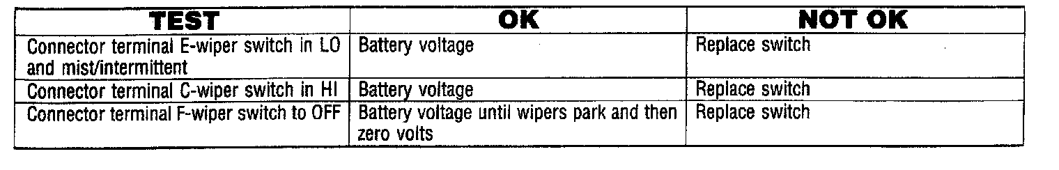 4. WIPER/WASHER SWITCH: Ignition in RUN, wiper switch position as indicated, back probe switch side of connector A for standard, connector B for intermittent