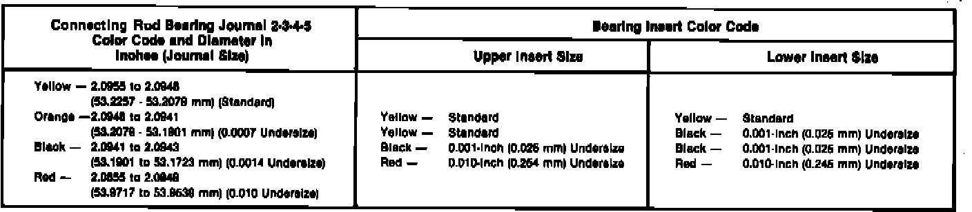 The connecting rod journal is identified by a color coded paint mark on adjacent cheek or counterweight toward flanged (rear) end of crankshaft. Color codes used to indicate journal sizes and corresponding bearing sizes are listed in Fig. 12.