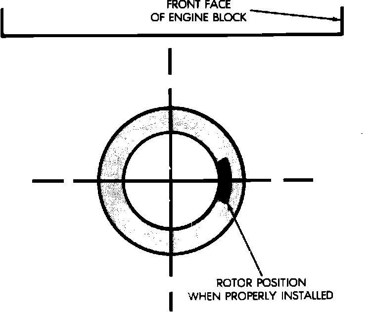 11. Slide the distributor shaft down into the engine; align the scribe marks on the distributor housing with the corresponding scribe mark on the cylinder block. It may be necessary to move the rotor and shaft slightly to engage the distributor shaft with the slot in the oil pump shaft. The same may have to be done to engage the distributor gear with the camshaft gear. However, the rotor should align with the scribe mark when the distributor shaft is down in place.