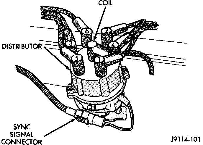 5. Verify that distributor cap is correctly attached to distributor. Ensure that spark plug cables are firmly connected to the distributor cap and the spark plugs in their correct firing order. Ensure that coil cable is firmly connected to distributor cap and coil. Ensure that sync signal generator wire connector is firmly connected to harness connector. Inspect spark plug condition. Connect vehicle to an oscilloscope and inspect spark events for fouled or damaged spark plugs or cables.