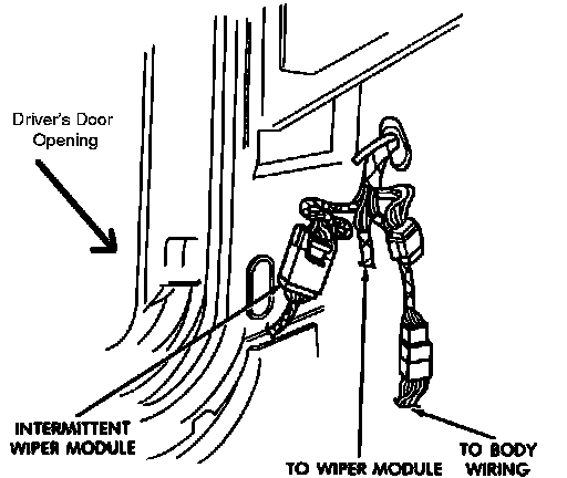 The intermittent wiper module is attached to the left cowl side trim panel with a hook and loop fastener patch.