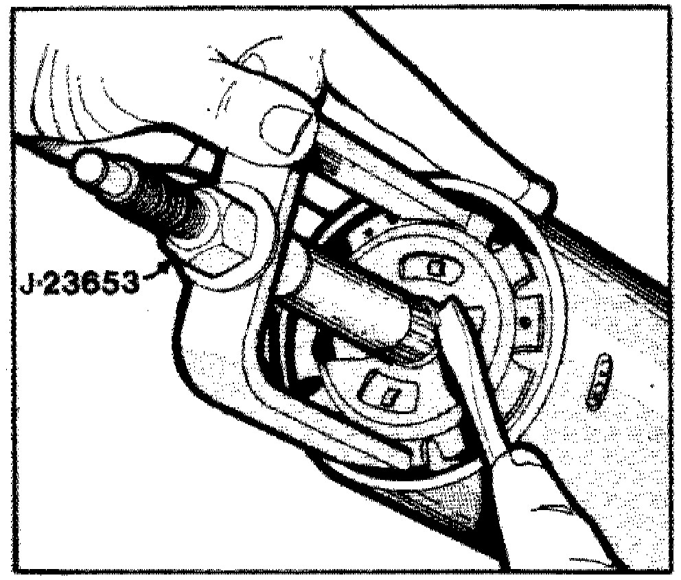 c. If the steering shaft is of the metric type, replace compressor tool bolt with metric forcing bolt J-23653-A or equivalent before installing compressor tool onto steering shaft. The lock plate is under strong spring tension.
