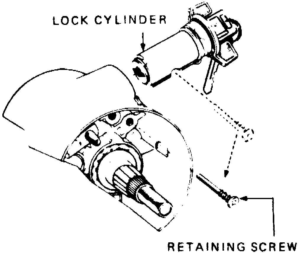 13. On models without lock cylinder retaining screw, rotate lock cylinder two detents clockwise beyond the Off-Unlock position. Insert a thin blade screwdriver through slot in steering column, then depress lock cylinder retaining tab and remove lock cylinder.