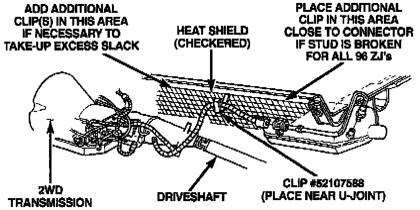 2. Install clip P/N 52107588 to the underbody heat shield as shown. Route the harness through the clip to assure that the harness will not contact the propeller shaft. Use as many clips as are necessary to accomplish the routing.