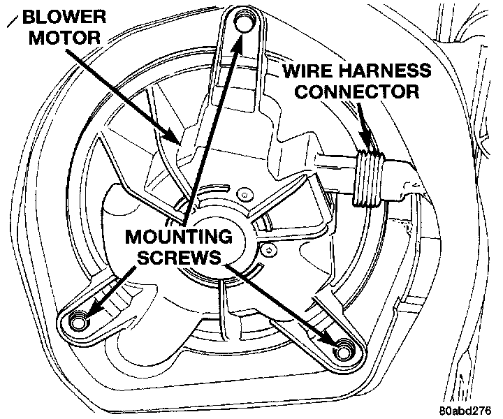 2. Install and tighten the three screws that secure the blower motor to the heater A/C housing. Tighten the mounting screws to 2.2 Nm (20 in. lbs.).
