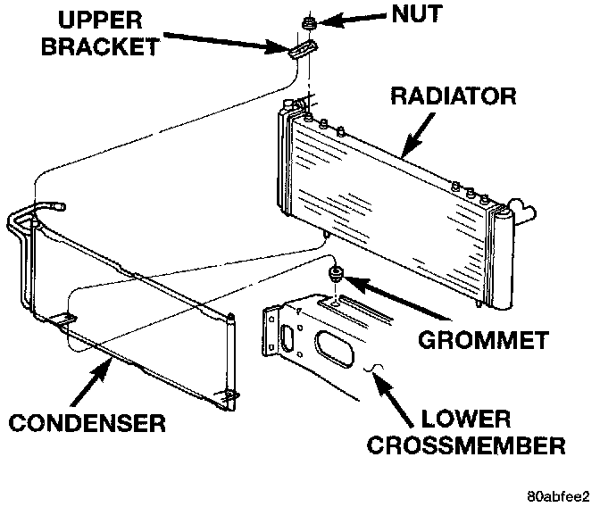 6. Remove the four nuts that secure the upper brackets to the radiator and the condenser.