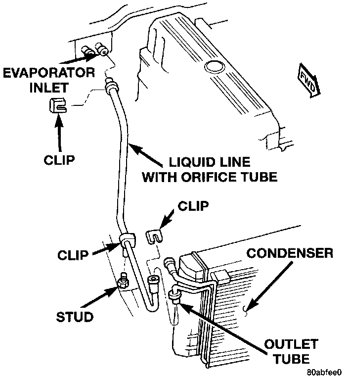 The fixed orifice tube is located in the liquid line near the condenser. The orifice has filter screens on the inlet and outlet ends of the tube body. If the fixed orifice tube is faulty or plugged, the liquid line unit must be replaced. See the service procedures for the liquid line.