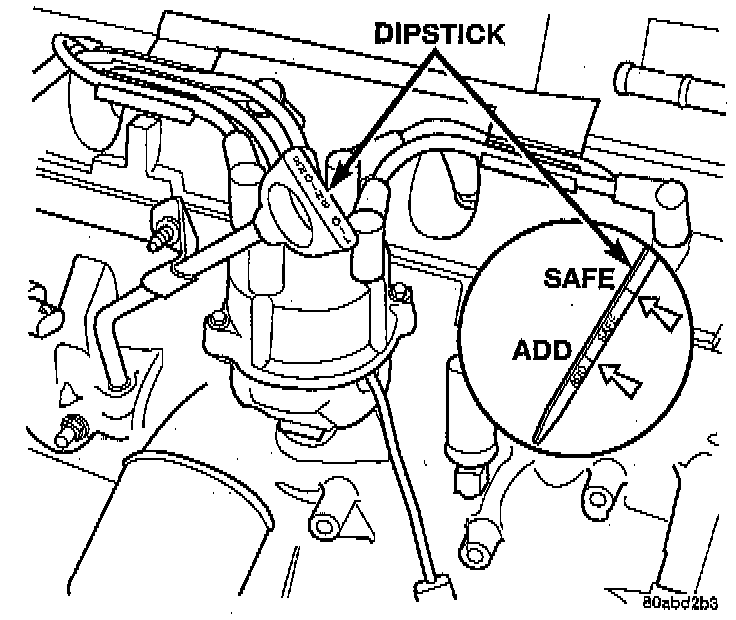 ^ To ensure proper lubrication of an engine, the engine oil must be maintained at an acceptable level. The acceptable levels are indicated between the ADD and SAFE marks on the engine oil dipstick.