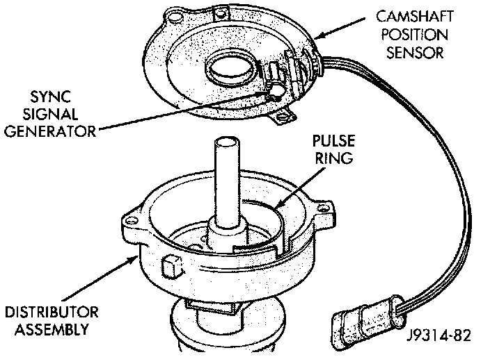 All engines are equipped with a camshaft driven mechanical distributor containing a shaft driven distributor rotor. All distributors are equipped with an internal camshaft position (fuel sync) sensor (Fig. 2). This sensor provides fuel injection synchronization and cylinder identification.