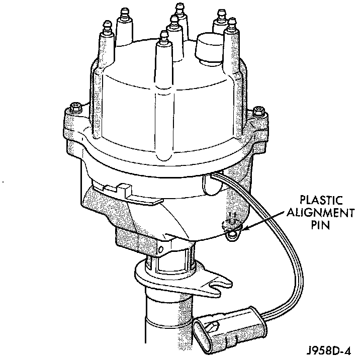 4. If the original distributor is to be reinstalled, such as during engine overhaul, the plastic pin will not be available. A 3/16 inch drift pin punch tool may be substituted for the plastic pin.