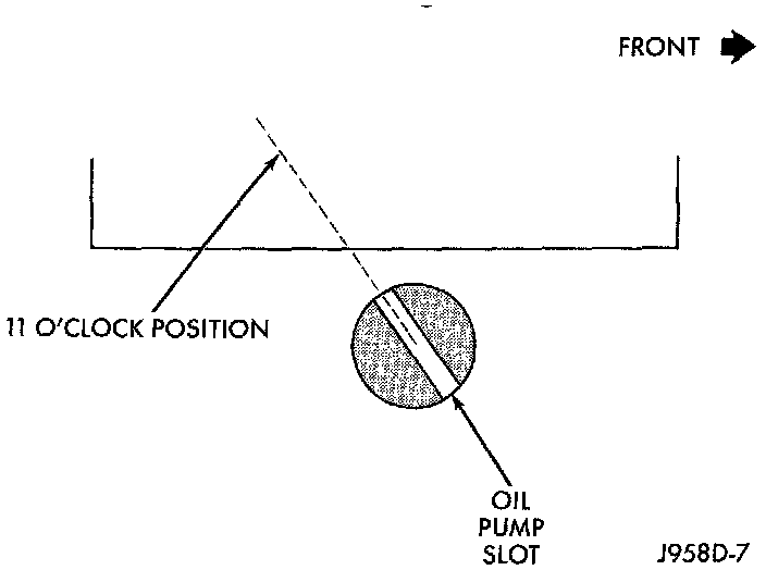 14. Observe the slot in the oil pump gear through the hole on the side of the engine. It should be slightly before (counterclockwise of) the 11 o'clock position (Fig. 39).