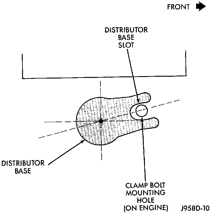 ^ The centerline of the slot at the base of the distributor is aligned to the centerline of the distributor holddown bolt hole on the engine. In this position, the holddown bolt should easily pass through the slot and into the engine.