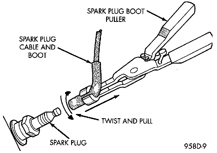 CAUTION: When disconnecting a high voltage cable from a spark plug or from the distributor cap, twist the rubber boot slightly (1/2 turn) to break it loose (Fig. 7). Grasp the boot (not the cable) and pull it off with a steady, even force.