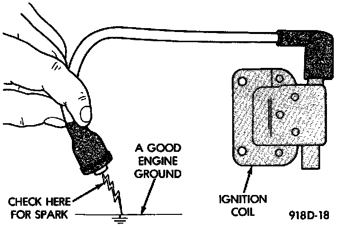 1. Disconnect the ignition coil secondary cable from center tower of the distributor cap. Hold the cable terminal approximately 12 mm (1/2 in.) from a good engine ground (Fig. 8).