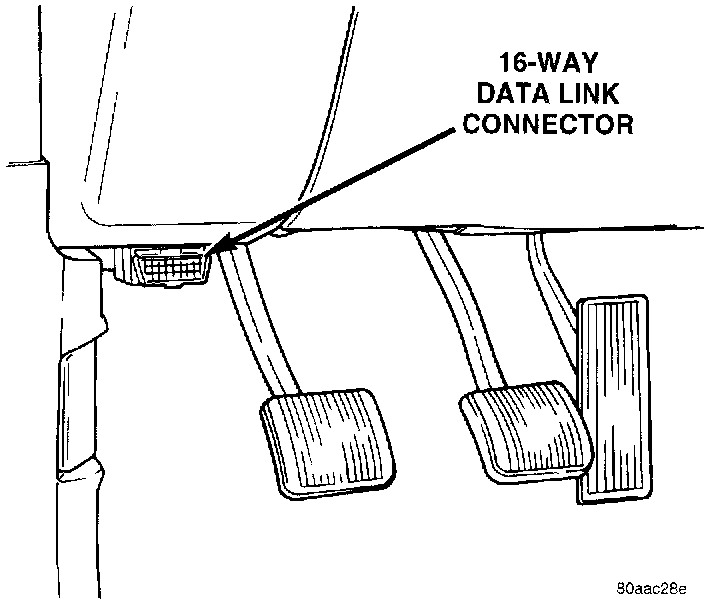 1. Connect the DRB scan tool to the data link (diagnostic) connector. This is located in the passengers compartment, below instrument cluster, and to the left of steering column (Fig. 1).